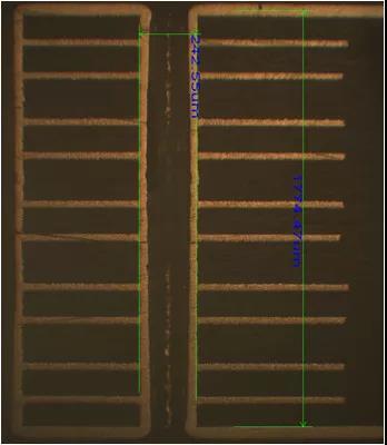 由于2mil/2mil線路細(xì)密,在影像轉(zhuǎn)移過(guò)程需要有精良的對(duì)位精度和優(yōu)良的解析能力,干膜附著力,蝕刻需有均勻蝕刻等要求。行業(yè)內(nèi)均推薦LDI爆光,使用1mil的干膜,有些板廠客戶已引進(jìn)真空蝕刻機(jī)加二流體進(jìn)行蝕刻。